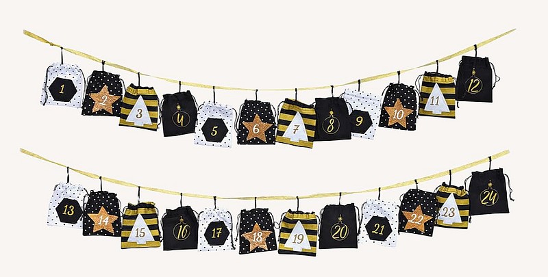 Adventskalender Girlande. Schwarz, Gold und Weiße Säckchen