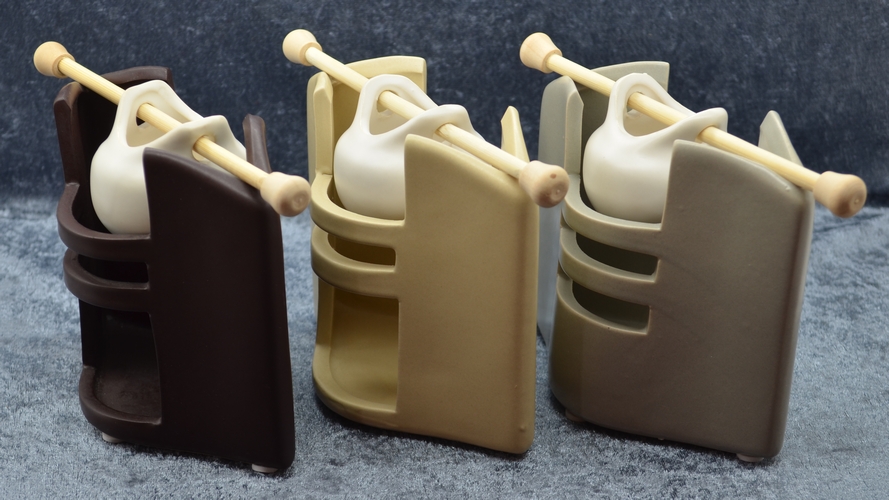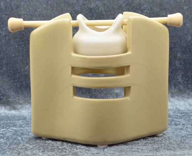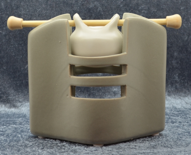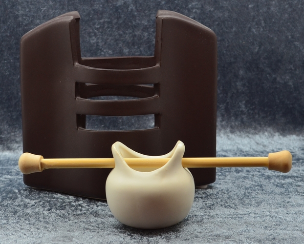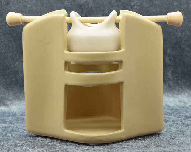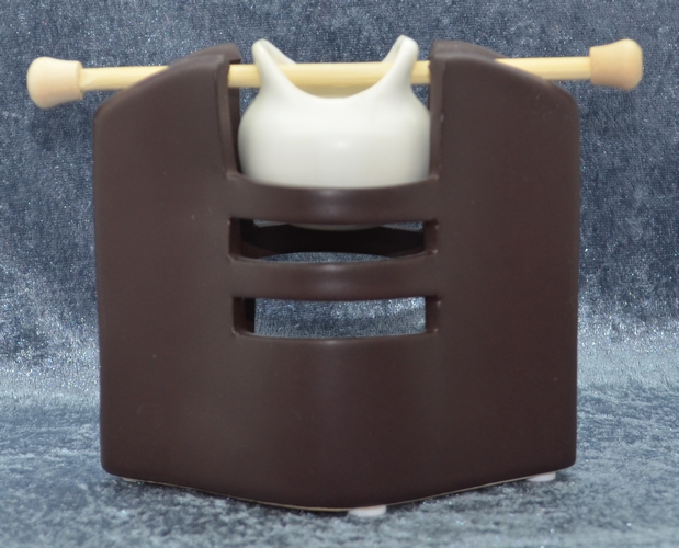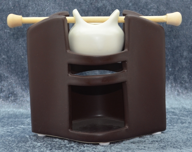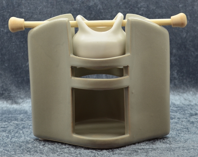 Ein Kessel wird mit Hilfe eines Holzstabes ausbalanciert
