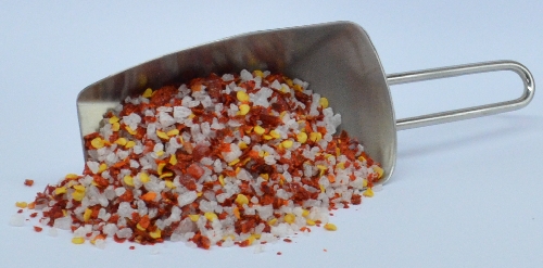 Bei unserem Chilisalz handelt es sich um eine mittelscharfe Sorte. Grobes Meersalz aus Italien gemischt mit geschroteten Chili aus China.