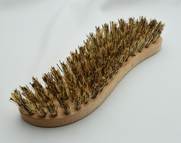 Diese Waschbürste (Wurzelbürste) wird mit Unionfaser (aus zwei Pflanzenfasern) hergestellt. Sie hat dunkle Borsten.S-Form Ausführung.
